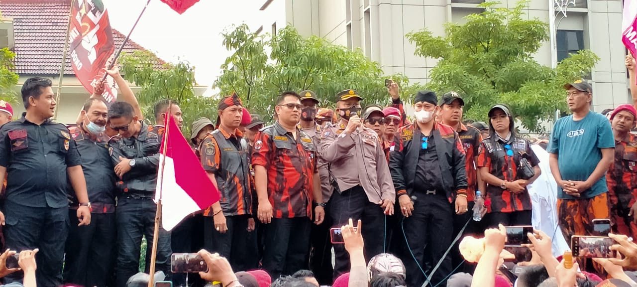 Pantauan di lapangan siang ini massa menyampaikan aspirasi dengan dijaga aparat Kepolisian. Mereka membawa spanduk dan bendera merah putih juga bendera kebesaran ormas pemuda pancasila.