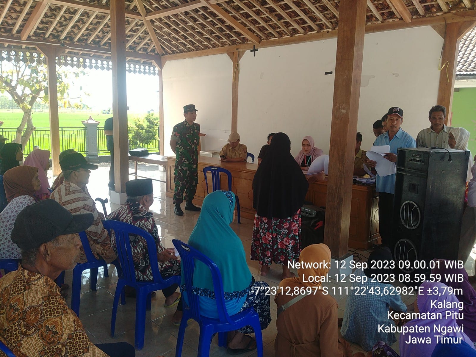 Seperti yang dilakukan Babinsa Posramil 0805/15 Pitu Koptu Heri Setio melaksanakan pengamanan dan pendampingan penyaluran Bantuan Langsung Tunai Dana Desa, di Balai Desa Kalang Kecamatan Pitu Kabupaten Ngawi, Selasa (12/09/2023).
