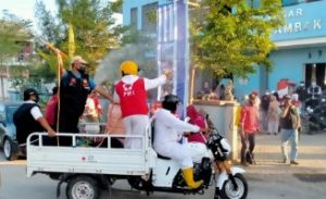 ” Kita bersama temen temen bergotong royong membantu masyarakat untuk selalu mengingatkan dan menghimbau terkait dengan protokol kesehatan termasuk hari ini membagikan masker dan juga penyemprotan disinfektan,” jelas Budiharto.
