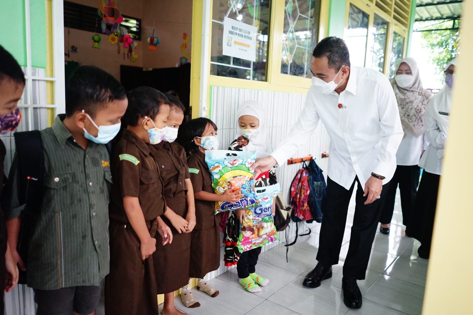 Tak hanya meninjau, Bupati pun menghibur anak – anak di kelas. Mulai dari bernyanyi, bersholawat serta mengajak bermain anak – anak di tempat penitipan anak yang ada. Setelah itu, pihaknya juga membagikan bingkisan makanan pada semua anak yang ditemui di sekolah tersebut.