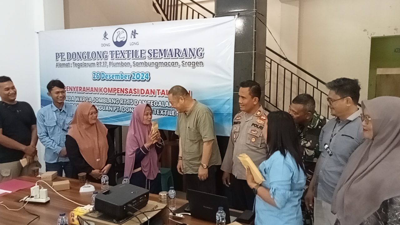 Penyerahan kompensasi kepada 132 kepala keluarga (KK) yang terdiri dari warga masyarakat Dukuh Jomblang RT 15 dan Dukuh Tegal Arum RT 17 Desa Plumbon. Penyerahan itu berlangsung di Kantor Cabang PT. Donglong SRAGEN, Kamis (26/12/2024) mulai pukul 09:00 WIB.