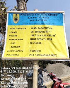 Proyek Pembangunan yang menggunakan anggaran dana desa tahun 2024 yang berlokasi di dukuh Bungkus RT 17 tersebut dalam papan informasi proyek menyebutkan Volume : 158×2,5×0,12=47,4 M³ , dengan Biaya : Rp50.714.000,- dan dikerjakan oleh warga setempat secara gotong royong. Dan di duga di handle oleh Pak Lurah sendiri.