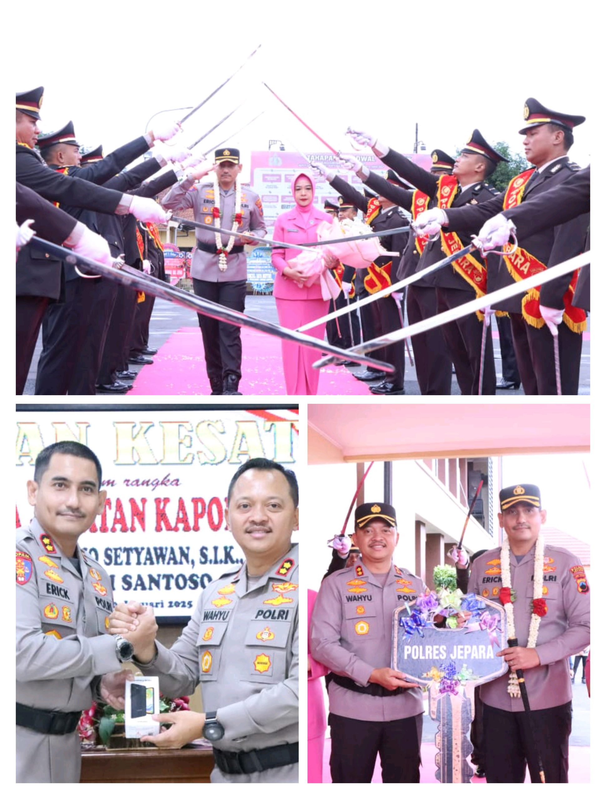 JEPARA | Kilasfakta com, – Tongkat komando Kepolisian Resor (Polres) Jepara dari Kapolres Jepara AKBP Wahyu Nugroho Setyawan resmi beralih ke AKBP Erick Budi Santoso, Senin (20/1/2025).
