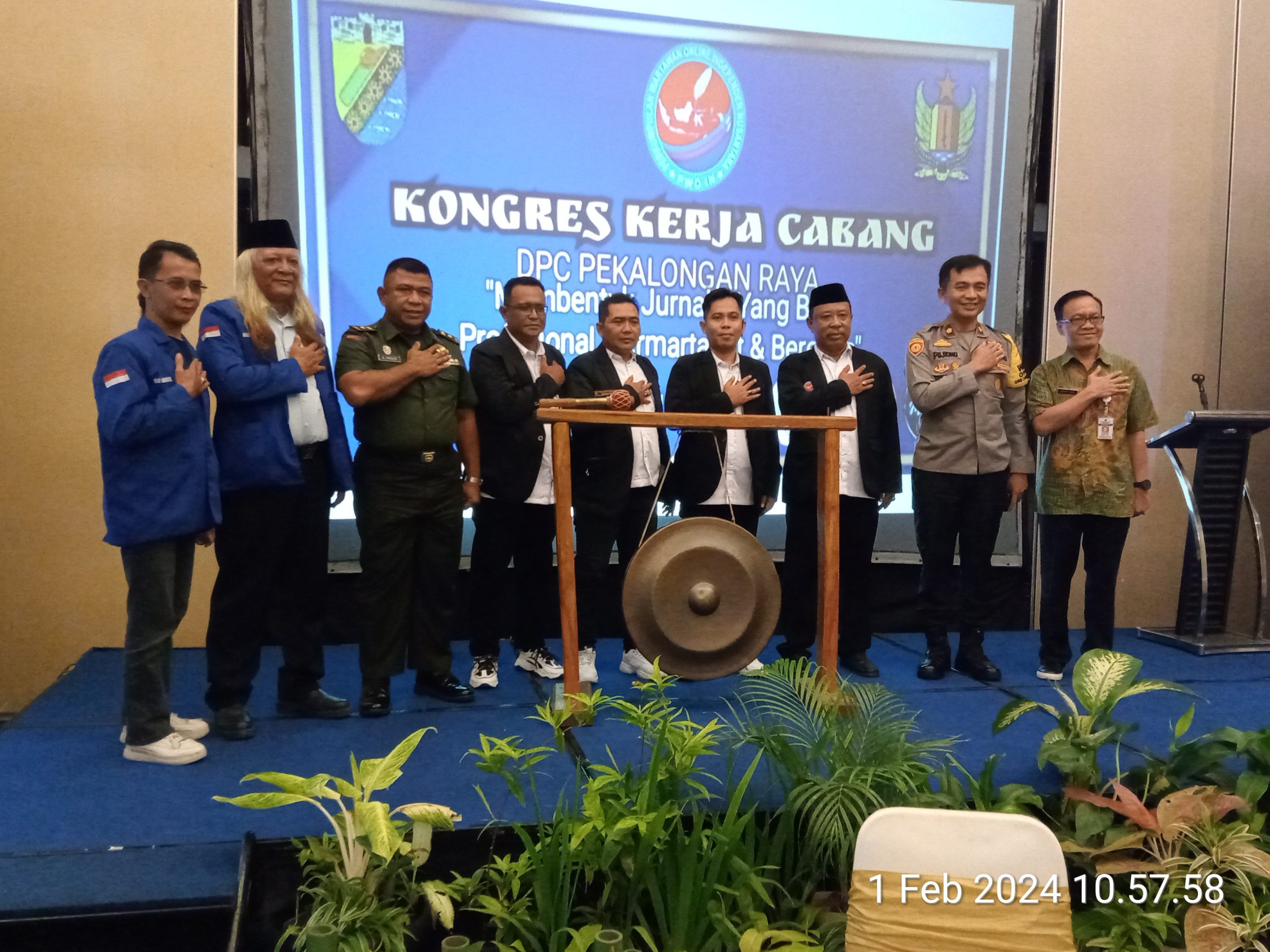 Mayor Kav. Akhmad Thohir Kasdim 0710 Pekalongan, secara simbolis membuka Kongres dengan memukul Gong sebanyak lima kali, yang disaksikan para hadirin dengan mengucapkan Bismillahirrohmaanirrohiim, Maka Kongres kerja DPC PWO-IN Pekalongan Raya Tahun 2024, Resmi dibuka. (Idris)