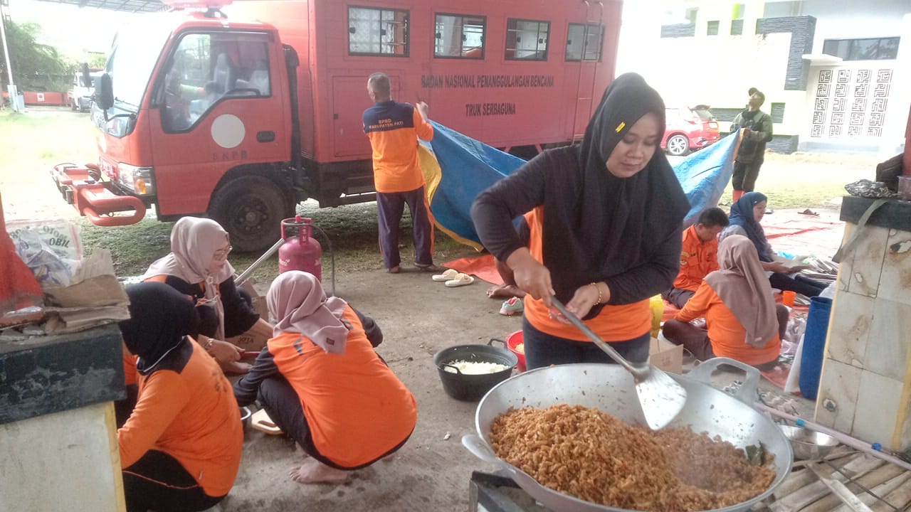 Dapur umum tersebut didirikan di area belakang Kantor BPBD Kabupaten Pati dan difungsikan untuk memasak makanan siap saji bagi warga yang terdampak banjir dan tidak dapat memenuhi kebutuhan makan secara mandiri. Relawan dari berbagai unsur diterjunkan untuk mendukung proses memasak hingga distribusi logistik.