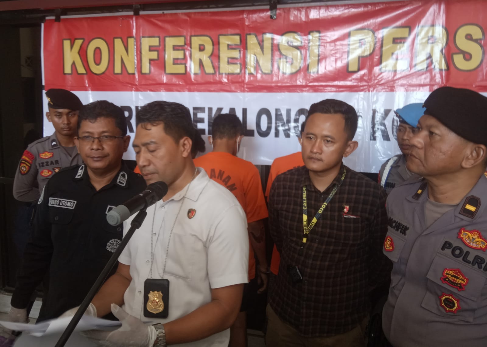 Adapun pelaku yang berhasil kita amankan adalah sebanyak 4 orang Pemuda, ya 4 orang yang ada di belakang kita ini. Adapun pelaku pertama berinisial AF usia 23 tahun harapannya, kemudian yang kedua IPW, Pendidikan SMP yang masih di bawah umur, ya umur nggak perlu kita disebut Disini, Alamatnya di Kelurahan kandang panjang kecamatan Pekalongan Utara, Dan yang ketiga adalah Inisialnya H alamatnya juga sama di Poncol, masih di bawah umur, kemudian yang keempat adalah tersangka berinisial ER berusia 21 tahun alamatnya sama Poncol Kecamatan Pekalongan timur.