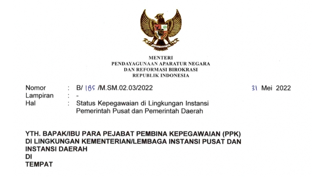 JAKARTA – Kilasfakta.com, Paling lambat, tanggal 28 November 2023, para Pejabat Pembina Kepegawaian (PPK) instansi pemerintah baik kementerian/lembaga maupun pemerintah daerah (K/L/D) harus sudah menentukan status kepegawaian pegawai non-Aparatur Sipil Negara (ASN). Himbauan ini disampaikan Menteri Pendayagunaan Aparatur Negara dan Reformasi Birokrasi (PANRB) Tjahjo dalam surat Menteri PANRB Nomor B/185/M.SM.02.03/2022 tentang Status Kepegawaian di Lingkungan Instansi Pemerintah Pusat dan Pemerintah Daerah yang ditandatangani Tjahjo pada 31 Mei 2022.