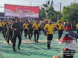 NGAWI – Kilasfakta.com, Bangun sinergitas dan jaga Soliditas TNI-Polri, Dandim 0805/Ngawi Letkol Inf Adi Wirawan,S.Hub.Int.,M.H.I, bersama Forkopimda Kabupaten Ngawi Laksanakan olahraga bersama dengan melaksanakan senam Aerobik dalam rangka hari Bhayangkara ke 77 tahun 2023 bertempat di halaman Mapolres Ngawi Jl.J.A Suprapto nomer 10, Kelurahan Ketanggi, Kecamatan Ngawi, Kabupaten Ngawi, Kamis (19/05/2023).