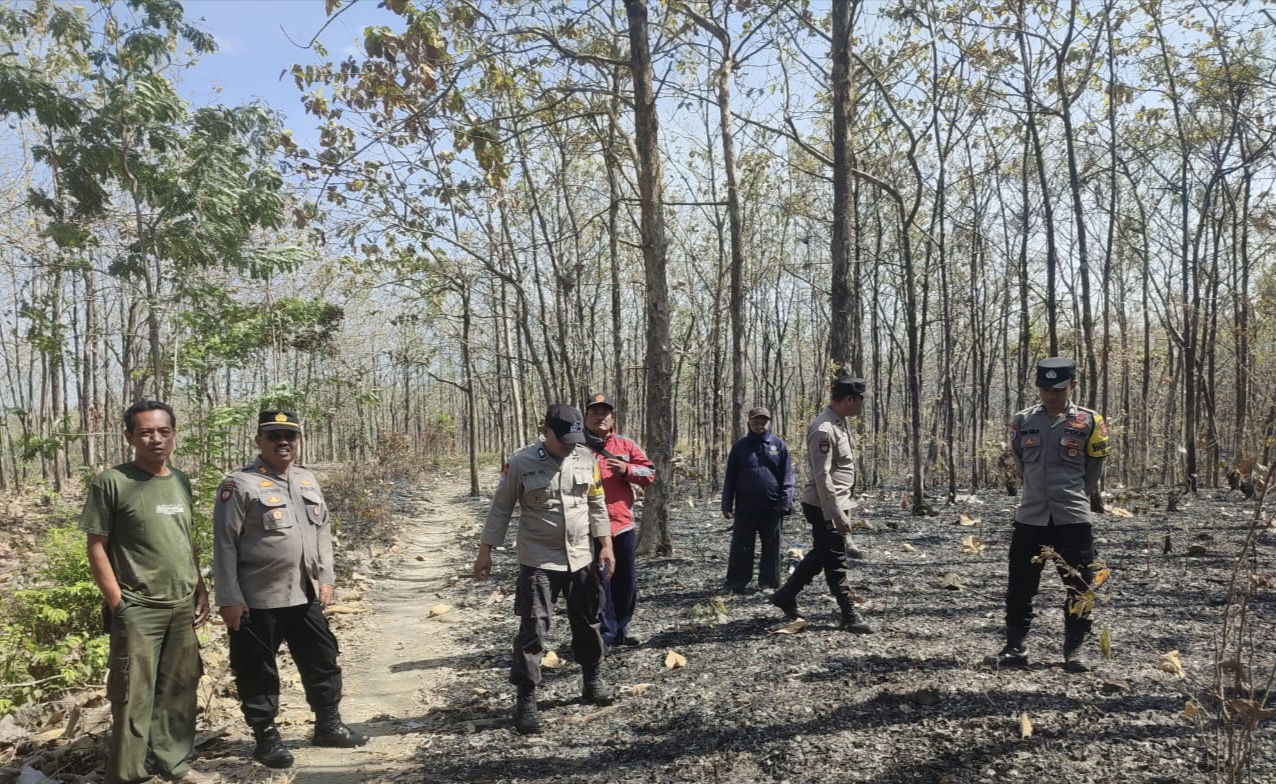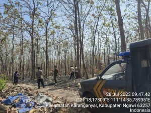 NGAWI – Kilasfakta.com, Kapolsek Karanganyar Resor Ngawi AKP Supardi bersama anggota dan Personil Perhutani Bagian Kesatuan Pengelolaan Hutan (BKPH) Payak melakukan pengecekan dan pemadaman kebakaran hutan dan lahan (Karhutlah), Jum’at (28/7/23).