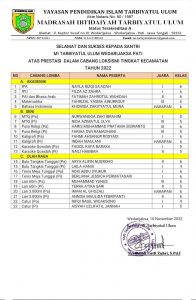 “Dari lima belas cabang lomba Loksismi ini, MI Tarbiyatul Ulum Wedarijaksa menyabet 10 medali emas dan berhak maju ke tingkat kabupaten yang akan diselenggarakan pada tanggal 14 sampai 15 Desember mendatang,” imbuh Luthfi.