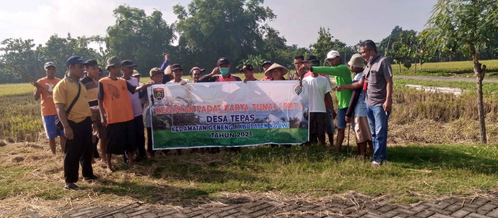 Desa Tepas, Kecamatan Geneng, Kabupaten Ngawi, Program Padat Karya Tunai (PKT) dilaksanakan pada hari Minggu tanggal 21 November 2021 dengan kegiatan normalisasi dan perbaikan saluran irigasi sawah.