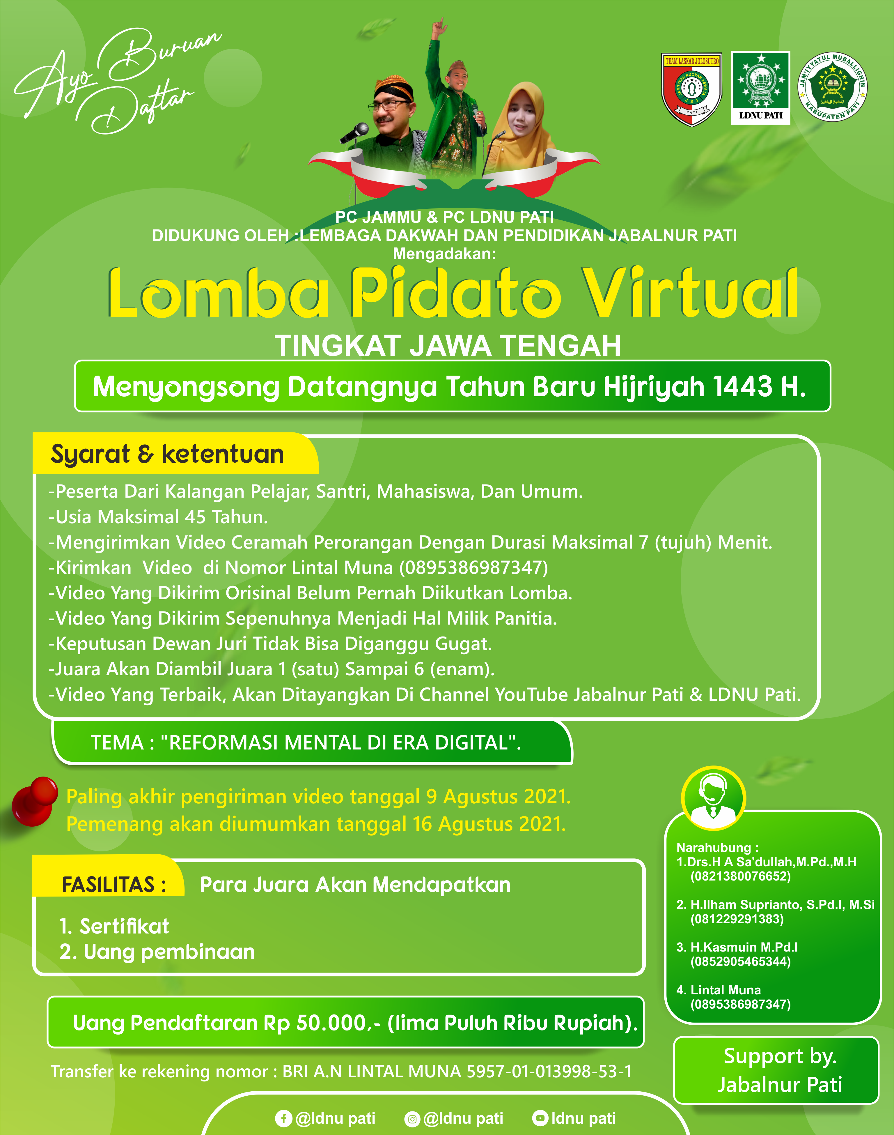 PC LDNU dan JAMMU Kabupaten Pati bersama Lembaga Dakwah & Pendidikan Jabalnur Pesantenan Pati akan menggelar lomba pidato tingkat Jawa Tengah.