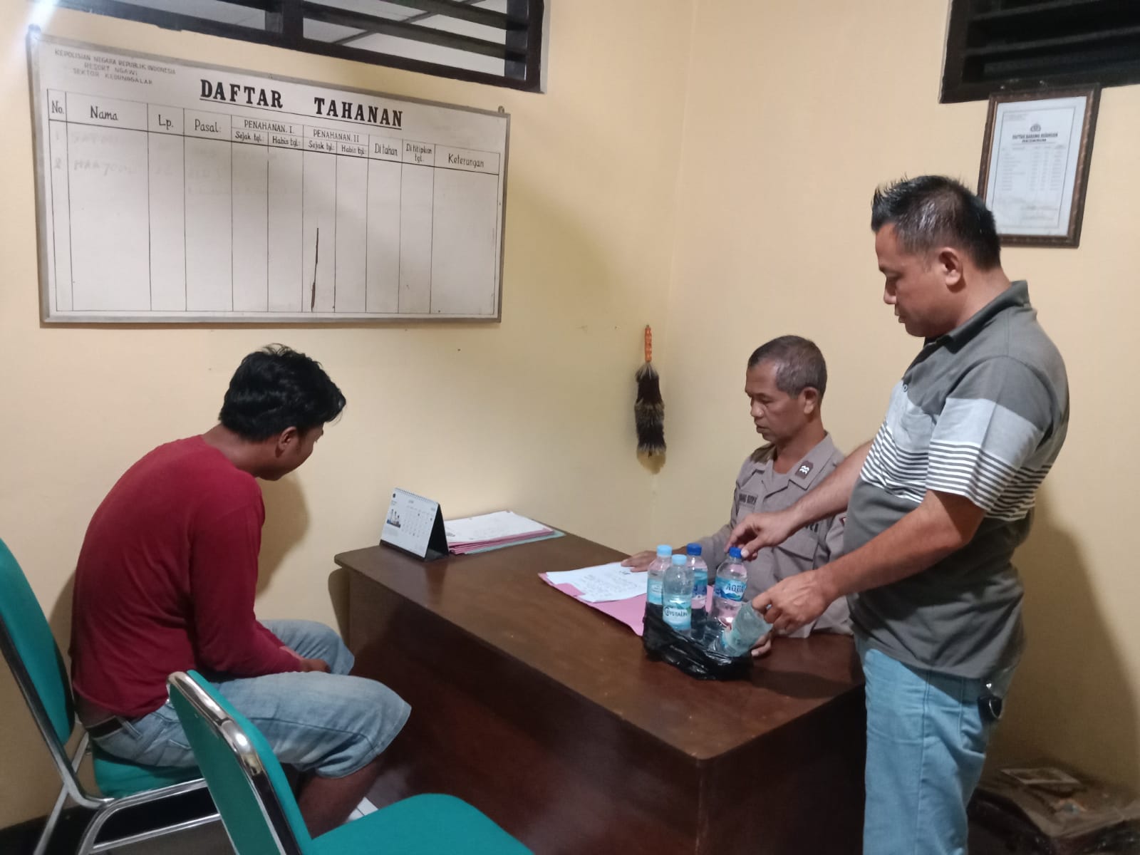 Selanjutnya polisi melakukan melakukan pemeriksaan yang disertai surat perintah, dan didapati ada 5 (lima) botol kecil bekas air mineral yang berisi sekitar 2,5 (dua setengah) liter arak jowo yang disimpan di bawah meja dibungkus tas plastik hitam.