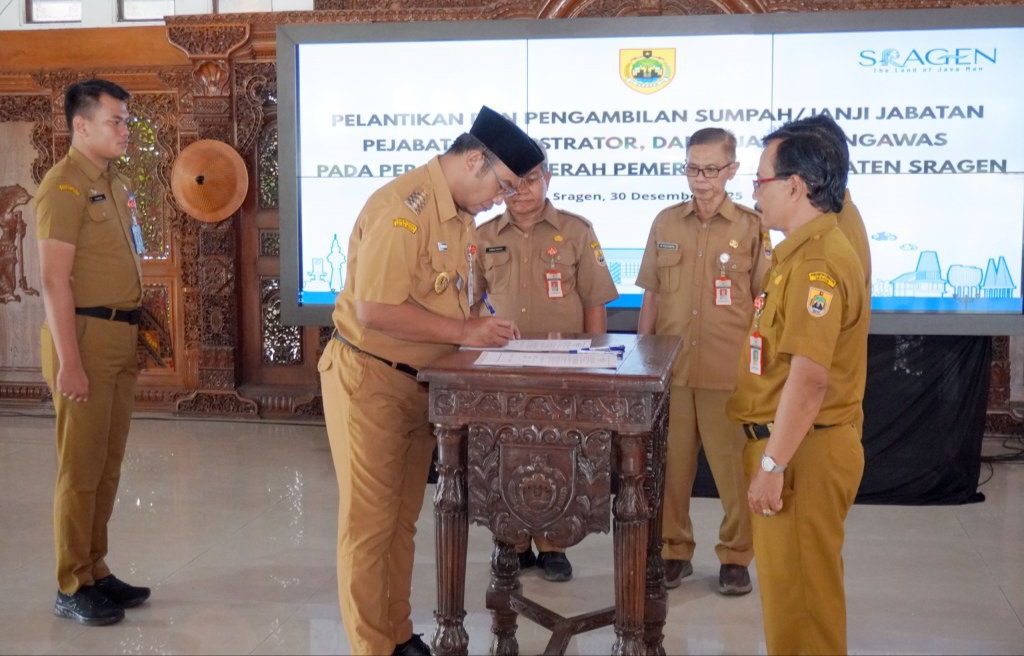 SRAGEN – Kilasfakta.com – Bupati Sragen Sigit Pamungkas melantik dan mengambil sumpah/janji jabatan pejabat administrator dan pejabat pengawas pada Perangkat Daerah Pemerintah Kabupaten Sragen di Pendopo Sumonegaran, Rumah Dinas Bupati Sragen, Selasa (30/12/2025).