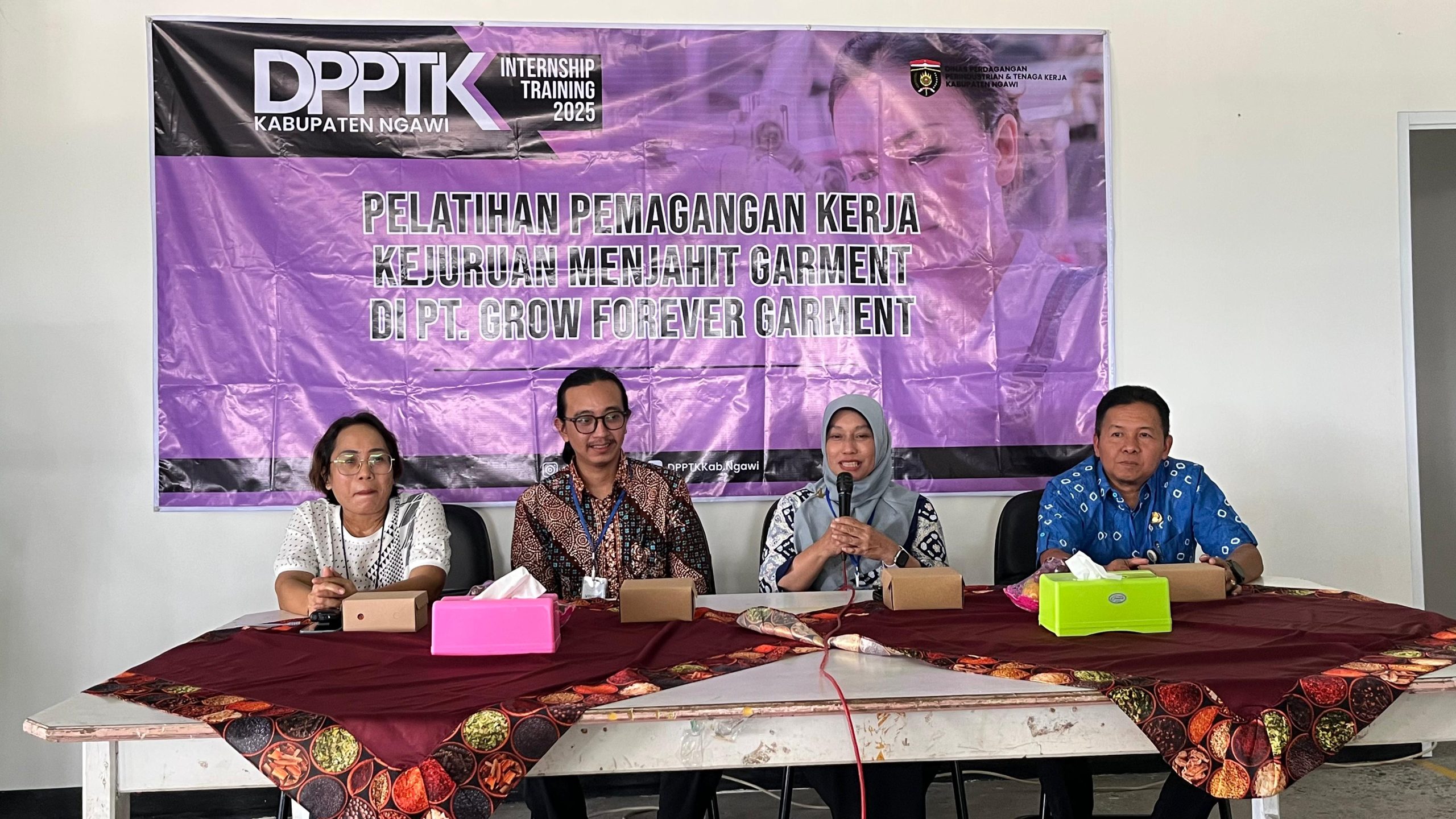 Ngawi – Kilasfakta.com – Dinas Perdagangan Perindustrian dan Tenaga Kerja Kabupaten Ngawi melalui Bidang Tenaga Kerja melakukan Pelatihan Pemagangan Kerja Kejuruan Menjahit Garment di PT. Grow Forever Garment Desa Sidorejo Kecamatan Geneng Kabupaten Ngawi. Pelatihan berlangsung selama 20 hari yang dimulai tanggal 21 Juli 2025 serta ditutup pada tanggal 15 Agustus 2025 yang diikuti oleh 50 peserta. Acara penutupan dipimpin langsung oleh Kepala Dinas Perdagangan Perindustrian dan Tenaga Kerja Kabupaten Ngawi Kusumawati Nilam Sulandrianingrum, S.Si, MT.
