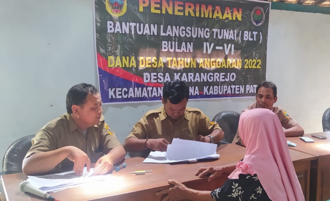 PATI – Kilasfakta.com, Sebanyak 113 Keluarga Penerima Manfaat (KPM) warga Desa Karangrejo, Kecamatan Juwana, Kabupaten Pati menerima Bantuan Langsung Tunai (BLT) tahap 4, 5 dan 6 tahun 2022. Bantuan social dari pemerintah pusat melalui Dana Desa itu dibagikan di balai desa setempat, Selasa (2/8).