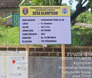 NGAWI – Kilasfakta.com – Gunakan dana BK Provinsi tahun anggaran 2024 Pemerintah Desa Klampisan Kecamatan Geneng Kabupaten Ngawi bangun paving jalan dengan volume 140 x 3,5 meter dengan dana sebesar Rp 135.000.000,00. Pengerjaan dilaksanakan secara swakelola sehingga membantu perekonomian warga setempat.