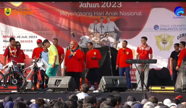 Hari ini kita happy-happy dan joget bareng karena ada Grup Band Aftershine bergabung bersama kita. Untuk memperingati Hari Anak Nasional yang ke-39 anak-anak Sragen harus menjauhi 3 hal yaitu tidak boleh memakai narkoba, tidak boleh melakukan seks bebas dan tidak boleh menikah sebelum usianya. Tiga itu saja, jadilah generasi muda.”ungkapnya. (Hendro)
