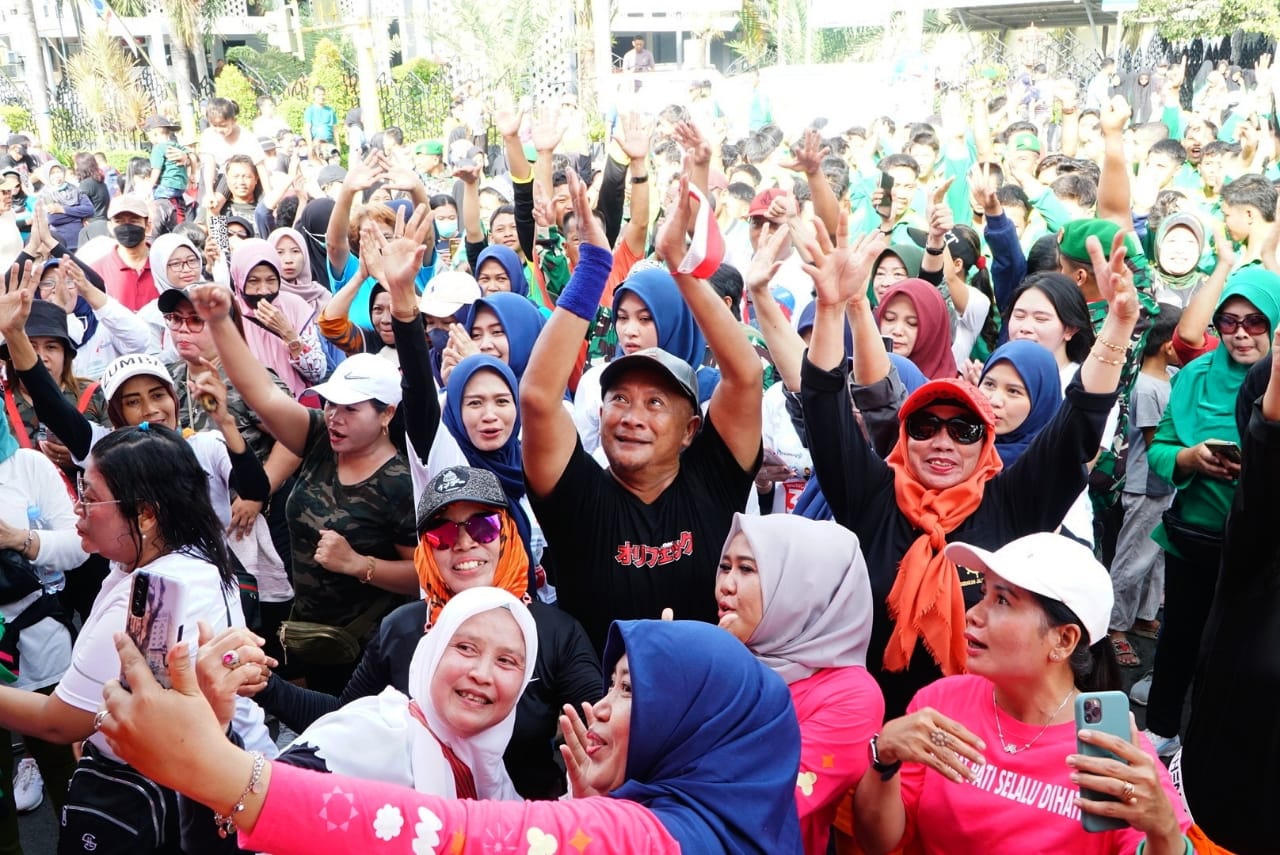 Pj Bupati Pati Henggar Budi Anggoro dan Dandim 0718/Pati Catur Irawan, tampak antusias untuk mengikuti senam dan berjoget bersama masyarakat yang memadati Alun-Alun Pati.
