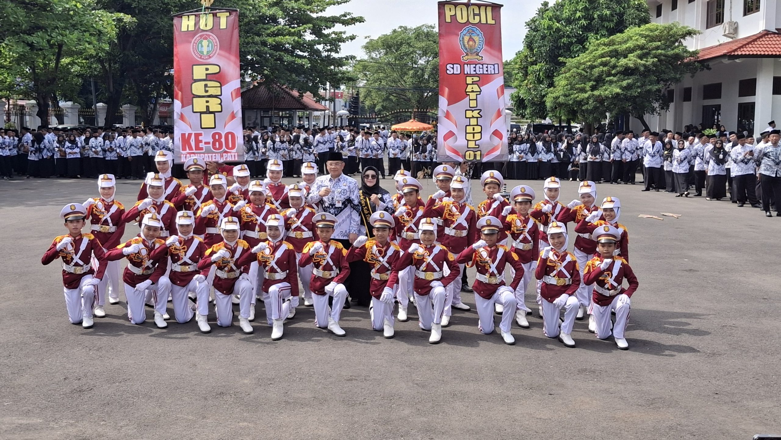 PATI — Kilasfakta.com, Penampilan Pasukan Polisi Cilik (Pocil) SDN Pati Kidul 01 berhasil mencuri perhatian seluruh peserta upacara peringatan Hari PGRI yang digelar di halaman Pendopo Kabupaten Pati. Dipimpin Danton Gentala, sebanyak 30 personel pocil tampil atraktif melalui peragaan baris-berbaris, variasi formasi, hingga pertunjukan seni kolosal bernuansa Jawa yang memukau.