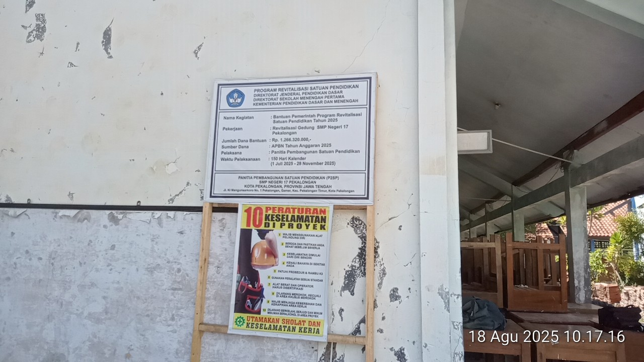 Revitalisasi gedung SMPN 17 kota Pekalongan yang dilaksanakan oleh panitia pembangunan dan Satuan Pendidikan (PSP) Kota Pekalongan, Provinsi Jawa Tengah, terlihat jelas papan informasi proyek yang telah terpasang serta banner 10 peraturan keselamatan kerja (K3).
