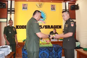 Selesai upacara dilaksanakan pemotongan tumpeng oleh Dandim Sragen kemudian diberikan kepada perwira paling muda Lettu Chk Heru Prasetyo, SH. (Hendro)