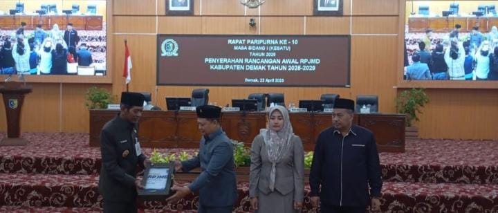Rancangan awal RPJMD (Rencana Pembangunan Jangka Menengah Daerah) Kabupaten Demak Tahun 2025 – 2029 serta penetapan dan penyerahan rekomendasi atau catatan strategi DPRD Kabupaten Demak terhadap laporan keterangan pertanggungjawaban (LKPJ) Bupati Demak Tahun wnggaran 2024 yang berlangsung di ruang rapat paripurna DPRD Kabupaten Demak, Selasa ( 22/4).