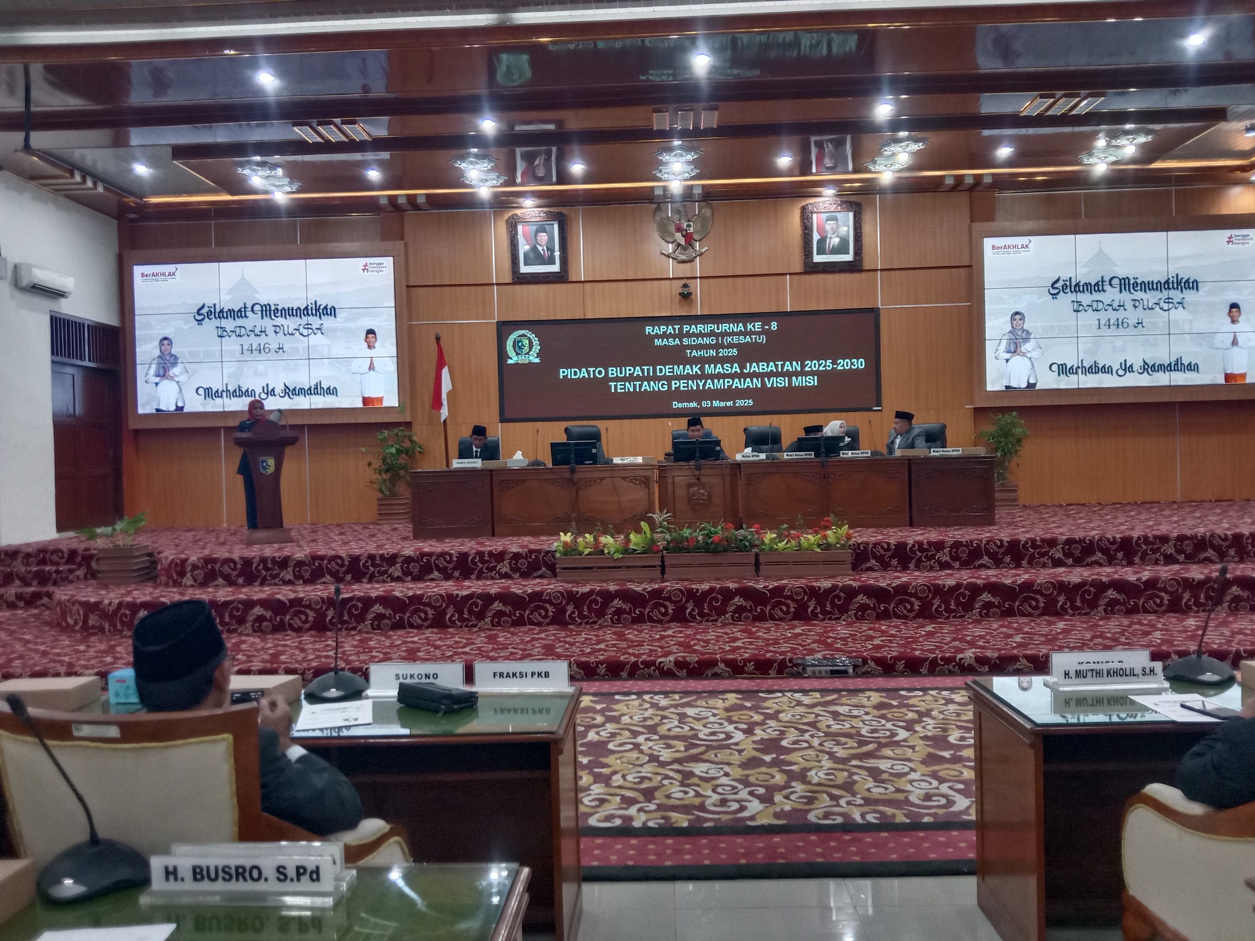 Rapat Paripurna DPRD ke 8, Bupati Demak dr, Hj Eistianah SE menyampaikan pidato Visi Misi pencapaian masa jabatan 2025-2030. Ketua DPRD Demak Zayinul Fata meminta agar Bupati dapat membangun kemitraan yang strategis dengan jajaran legislatif dalam mengemban amanat dan menjalankan tugasnya.