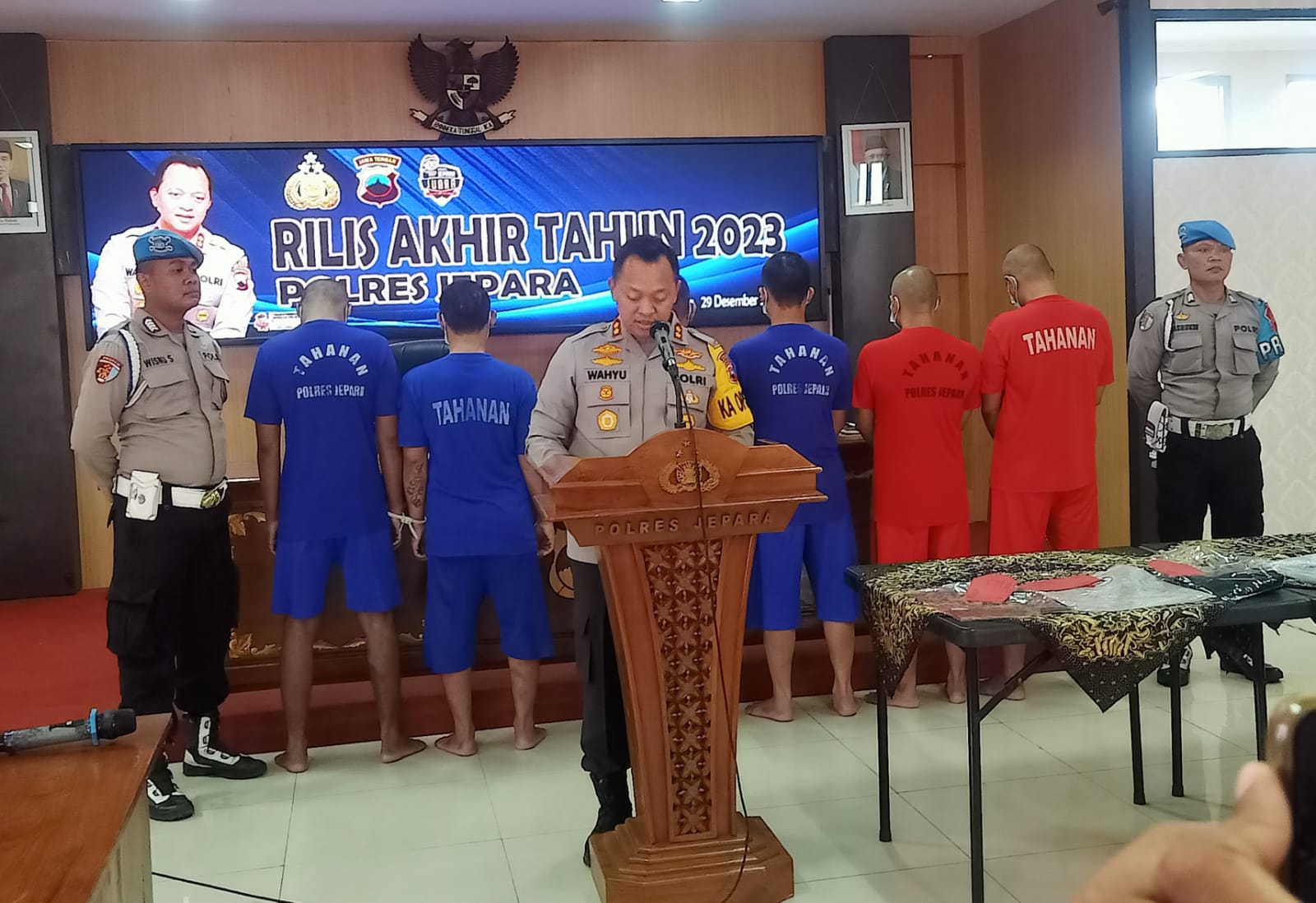 Pengungkapan kasus pencurian dengan kekerasan ini disampaikan Kapolres Jepara AKBP Wahyu Nugroho Setyawan melalui Kasat Reskrim Polres Jepara AKP Ahmad Masdar Tohari didampingi Kasubsipenmas Sihumas Polres Jepara Ipda Puji Sri Utami saat menggelar kegiatan konferensi pers akhir tahun di Aula Mapolres Jepara, Jumat (29/12/2023).