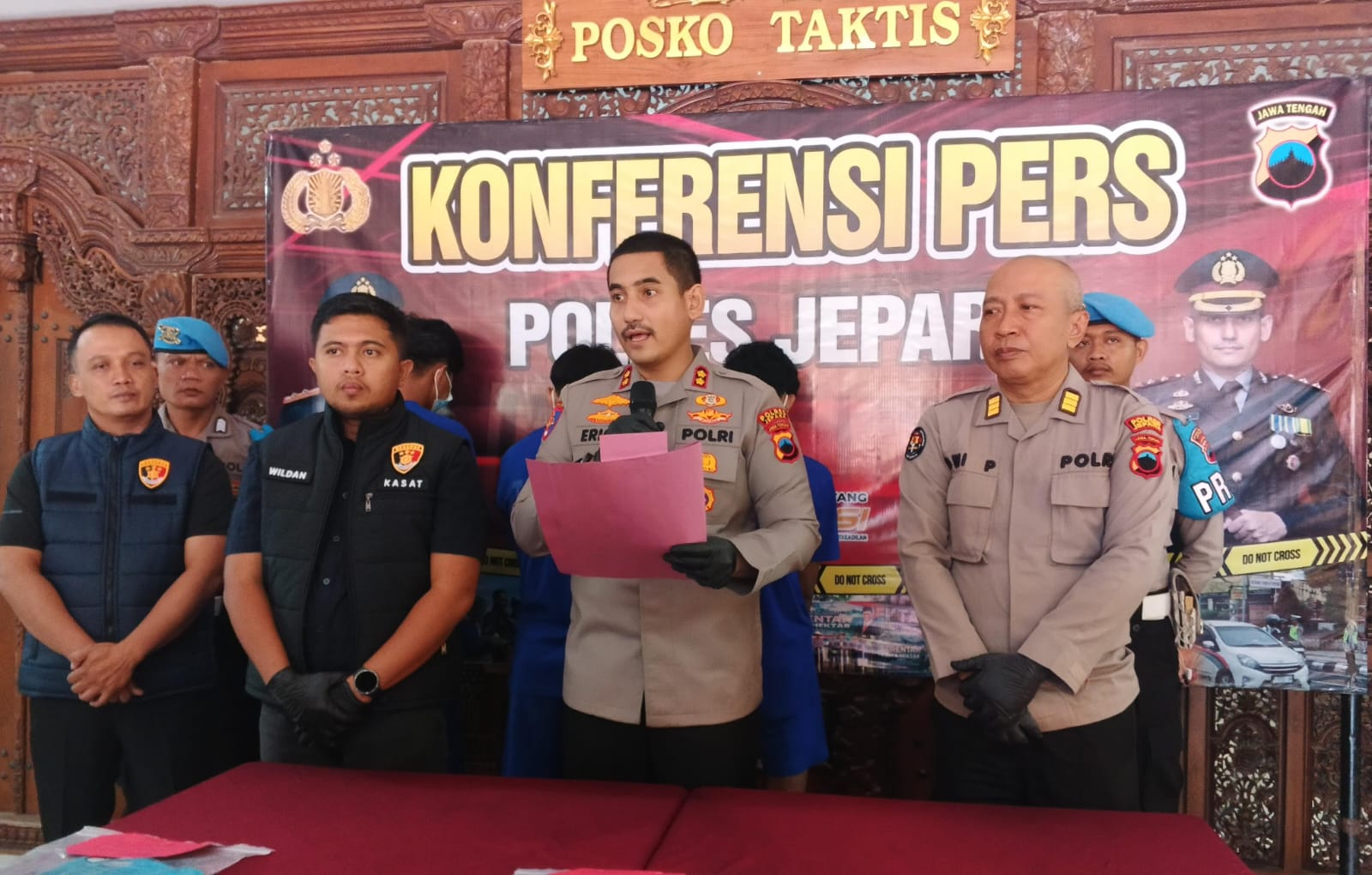 “Saat itu, korban turun dari sepeda montor lalu dikeroyok dan dipukul tersangka BB, FQ dan DK secara bergantian hingga terjatuh tak sadarkan diri,” Kapolres Jepara AKBP Erick saat menggelar konferensi pers didampingi Kasatreskrim AKP M. Faizal Wildan Umar Rela dan Kasihumas AKP Dwi Prayitna di Mapolres Jepara, pada Rabu (30/7/2025).