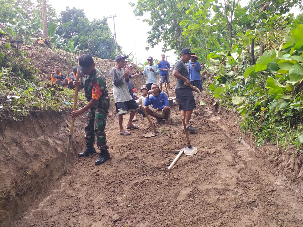 NGAWI – Kilasfakta.com, Anggota Koramil Geneng Kodim 0805/Ngawi Serka Sugianto membantu masyarakat dalam melaksanaka Perbaikan Jalan Makam Desa Tepas Kecamatan Geneng,Rabu (18/01/2023).