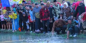 Diakhir acara, Bupati menebar ratusan jenis ikan mulai dari lele, mujair, nila dan patin. Ratusan ikan itu kemudian ditangkap oleh ratusan warga setempat.(kominfo/Hendro)