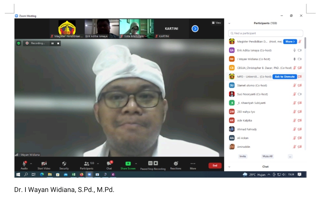 KUDUS Kilasfakta.com, Universitas Muria Kudus (UMK) rajin menjalin kerja sama dengan para universitas mitra, baik dalam maupun luar negeri. Baru-baru ini, yakni pada 1 April 2022, Program Studi Magister Pendidikan Dasar (Prodi MPD UMK) selenggarakan Kuliah Umum secara virtual melalui platform zoom dengan menghadirkan pemateri dari Universitas Pendidikan Ganesha. Sebelumnya, yakni pada 29 Maret 2022 Prodi MPD UMK Dasar juga menyelenggarakan Kuliah Tamu dengan pemateri Dr. Tenku Putri Norishah Tenku Shariman dari Multimedia University, Malaysia.