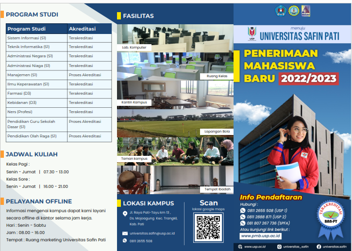 PATI, – Kilasfakta com, Universitas Safin Pati (USP) merupakan universitas pertama di Pati. Perguruan tinggi ini berada di bawah naungan Yayasan Safin Bina Bangsa yang berkedudukan di Jalan Pati – Tayu KM 13 Desa Mojoagung, Kecamatan Trangkil, Pati, Jateng. Ketua Dewan Pembina Yayasan Safin Bina Bangsa adalah H. Saiful Arifin yang saat ini juga menjabat sebagai Wakil Bupati Pati. Rektor USP dijabat oleh Dr. Drs. H. Murtono, M.Pd.